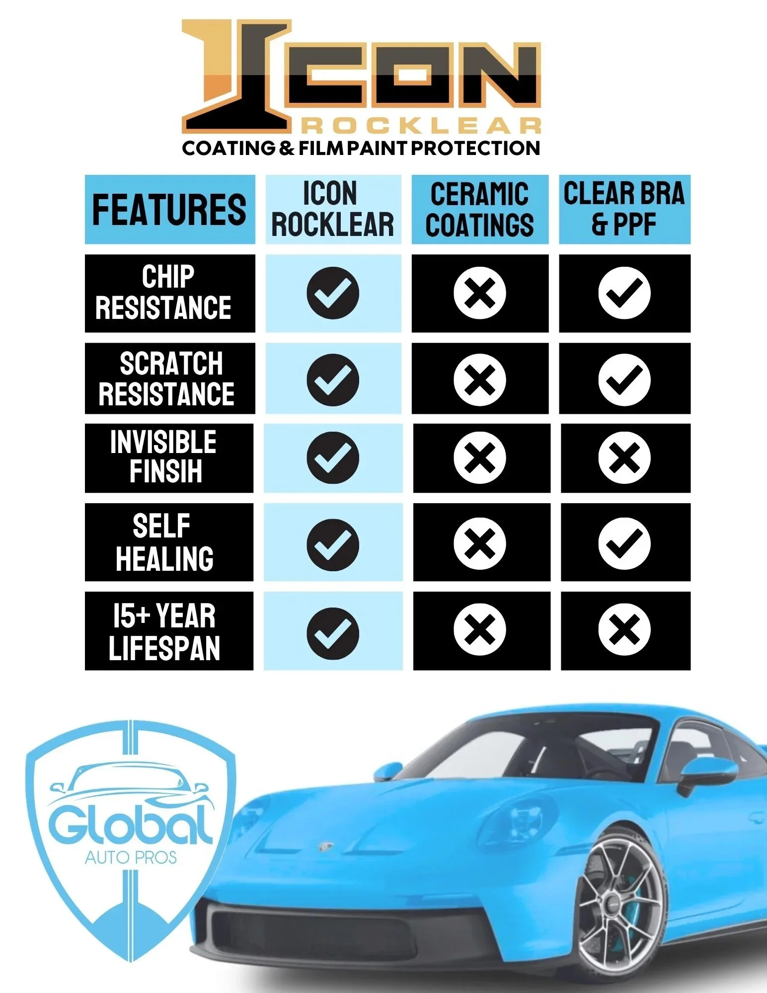 Icon Rocklear is 75x stronger and 35x thicker than ceramic coatings. It outlasts both ceramic coatings and paint protection film at a fraction of the lifetime cost!